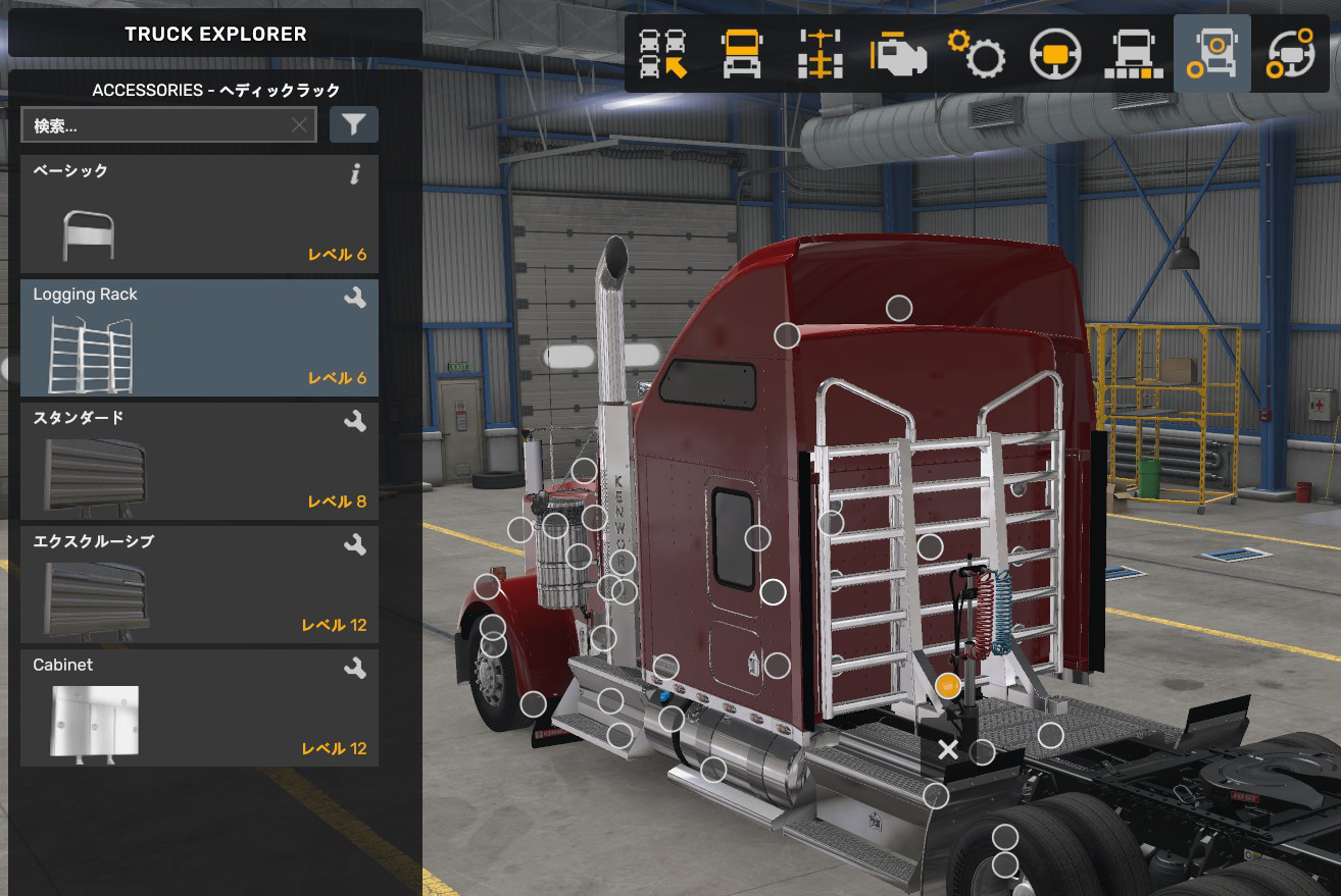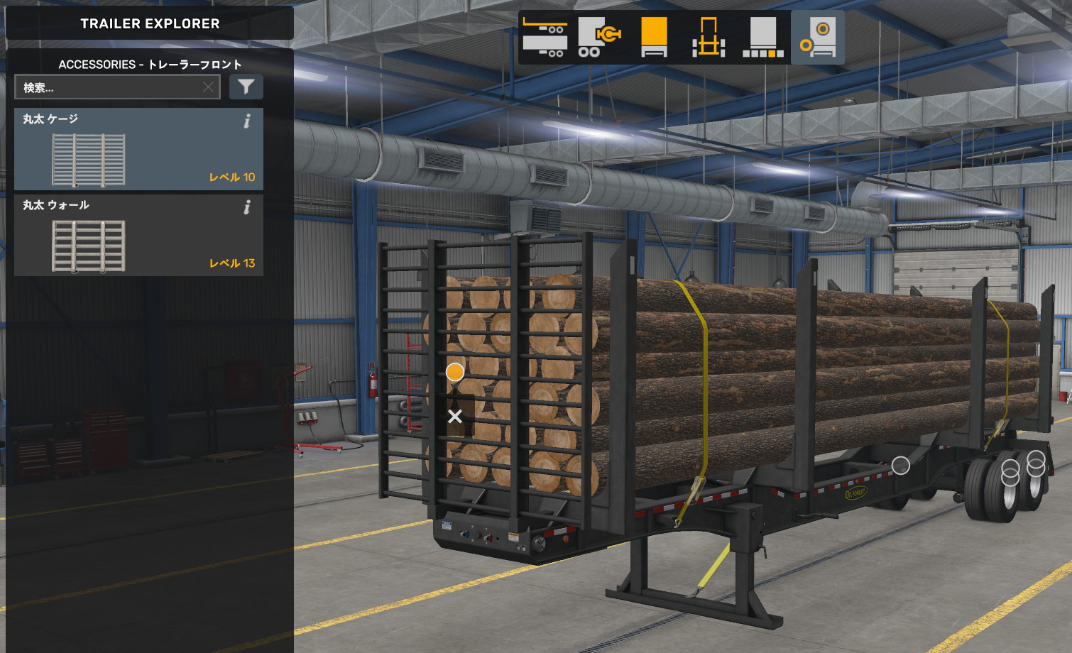 へディックラックとはキャビンと貨物の間に立てる“防護柵”のことで、なんらかの衝撃で積荷が動いてキャビンを押しつぶさないようにする目的があります。Forest Machineryパックにはこのへディックラックが同梱されており、全てのトラックに適用することが出来ます。